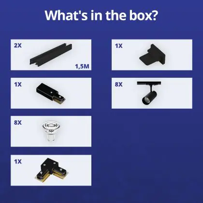 | Herstellername | Complete L shaped 1-Phase Track Set Black incl. 8x Spot fixture + GU10 2700K 3W Dim – 1,5 x 1,5 mete | |