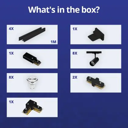 | Herstellername | Complete L shaped 1-Phase Track Set Black incl. 8x Spot fixture + GU10 2700K 3W Dim – 2 x 2 meter i | |