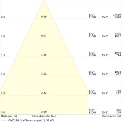Der Abstrahlwinkel bezeichnet den Winkel, in dem das Licht aus der Lichtquelle ausgestrahlt wird. Er wird in Grad (D) angegeben. Je geringer die Gradzahl des Abstrahlwinkels ist, desto kleiner ist auch der Durchmesser des Lichtkegels, den die Lichtquelle produziert. Beispiel: Wird eine Lampe mit einem Abstrahlwinkel von 60 Grad an der Decke (2,5 m Höhe) angebracht, erzeugt sie einen Lichtkegel von 2,9 Metern Durchmesser. Hat die Lampe hingegen einen Abstrahlwinkel von 120 Grad, beträgt der Lichtkegel 8,7 Meter im Durchmesser. |