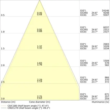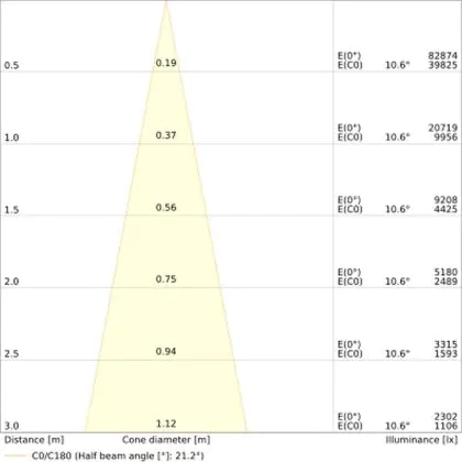 Der Abstrahlwinkel bezeichnet den Winkel, in dem das Licht aus der Lichtquelle ausgestrahlt wird. Er wird in Grad (D) angegeben. Je geringer die Gradzahl des Abstrahlwinkels ist, desto kleiner ist auch der Durchmesser des Lichtkegels, den die Lichtquelle produziert. Beispiel: Wird eine Lampe mit einem Abstrahlwinkel von 60 Grad an der Decke (2,5 m Höhe) angebracht, erzeugt sie einen Lichtkegel von 2,9 Metern Durchmesser. Hat die Lampe hingegen einen Abstrahlwinkel von 120 Grad, beträgt der Lichtkegel 8,7 Meter im Durchmesser. |