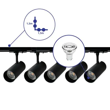 | Nom du fabricant | Complete L shaped 1-Phase Track Set Black incl. 5x Spot fixture + GU10 2700K 3W Dim – 1,5 x 1,5 mete | |