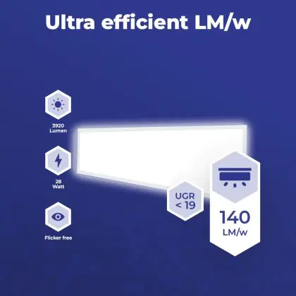 Les panneaux LED sont des solutions éco-énergétiques permettant de remplacer les panneaux classiques équipés de tubes fluorescents. Ce panneau Dalle LED Pro V5 28W 3920lm - 840 Blanc Froid| 120x30cm - UGR est conçu pour remplacer une dalle classique de 2x36. La consommation de ce panneau LED est considérablement plus faible qu’un panneau classique, à savoir, seulement 28 watts. Une économie d’énergie sans compromettre la qualité de la lumière. Le flux lumineux est de 3920 lumens. La lumière de ce panneau LED est diffusé à degrés et offre un bon rendu des couleurs. La durée de vie moyenne de ce panneau LED est de 100000 heures.