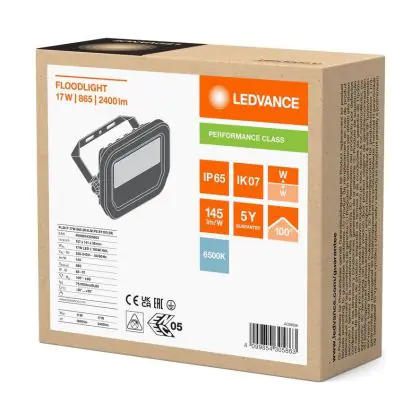 Le Ledvance Projecteur LED Aluminium Noir 17W 2400lm 100D - 865 | IP66 - Symétrique permet une économie d’énergie importante tout en conservant une excellente qualité d’éclairage. Sa technologie LED Intégré lui permet également d’avoir une très longue durée de vie pouvant aller jusqu’à 100000 heures. Ce projecteur LED est étanche, avec son indice de protection IP66 – Résistant à la poussière et à l'eau (fortes projections) lui permettant d’être hermétique à la poussière et à l’eau. Disponible dans la couleur 6500K - Lumière du Jour et un flux lumineux de 2400 Lm, ce projecteur LED est la solution idéale pour le remplacement de vos anciens projecteurs conventionnels.