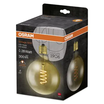 Cette ampoule Osram Vintage 1906 LED E27 Globe Filament Dorée 125mm 5W 250lm - 820 | Remplacement 25W est l’alternative idéale pour la remplacement de votre ampoule classique de 28 W. La technologie LED intégrée vous offrira de nombreux avantages. Les ampoules à incandescence traditionnelles ont une durée de vie limitée. Cette alternative LED vous permettra de profiter d’un éclairage durable et fiable.